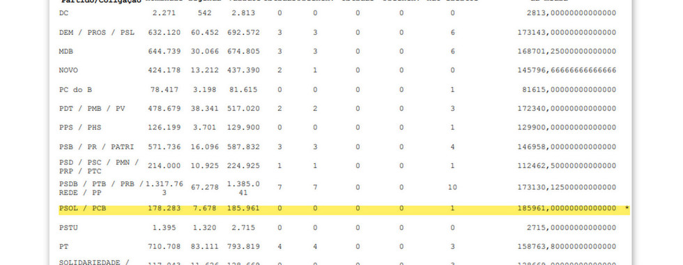 Na eleição de 2018 o PSOL concorreu coligado com o PCB (a partir de 2020 não são mais permitidas coligações nas eleições proporcionais), portanto, para fins de cálculo do quociente partidário, são considerados os votos dos dois partidos. PSOL / PCB - Votos nominais (Votos recebidos por todos os candidatos a deputado federal do PSOL e PCB) 178.283 votos + Votos na legenda (Votos na legenda nº 50 e nº 21) 7.678 votos = Total 185.961 votos