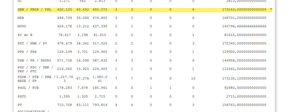 Assim como foi feito com o NOVO e a coligação PSOL/PCB é feito com todos os partidos e coligações que participaram da disputa até chegarmos ao primeiro preenchimento das vagas pelo quociente partidário. Nestas eleições foram um total de 24 vagas preenchidas pelo quociente partidário que leva em consideração apenas os número inteiros desconsiderando a fração conforme mostra a tabela.